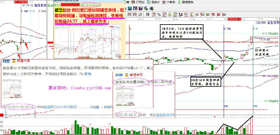 接下來,我們講下個股的實戰(zhàn)案例,這個股票就是益生股份,該股是在江恩時間窗口10月9日、10日放量突破站穩(wěn)江恩270度及極反通道生命線的,趨勢轉(zhuǎn)強,符合跟蹤操作規(guī)則。因此在10月16日股價縮量回踩生命線時做了詳細(xì)的圖形展示,股價隨后啟動拉升,并在10月25日時間窗口繼續(xù)加速封板,短短一周的時間已經(jīng)從最佳買點生命線上漲到階段減持點紅色線,單波利潤達(dá)到35%;如此巨大的上漲空間皆是因時間周期的精確預(yù)判而獲得??梢?,時間周期在個股分析交易中的巨大威力。