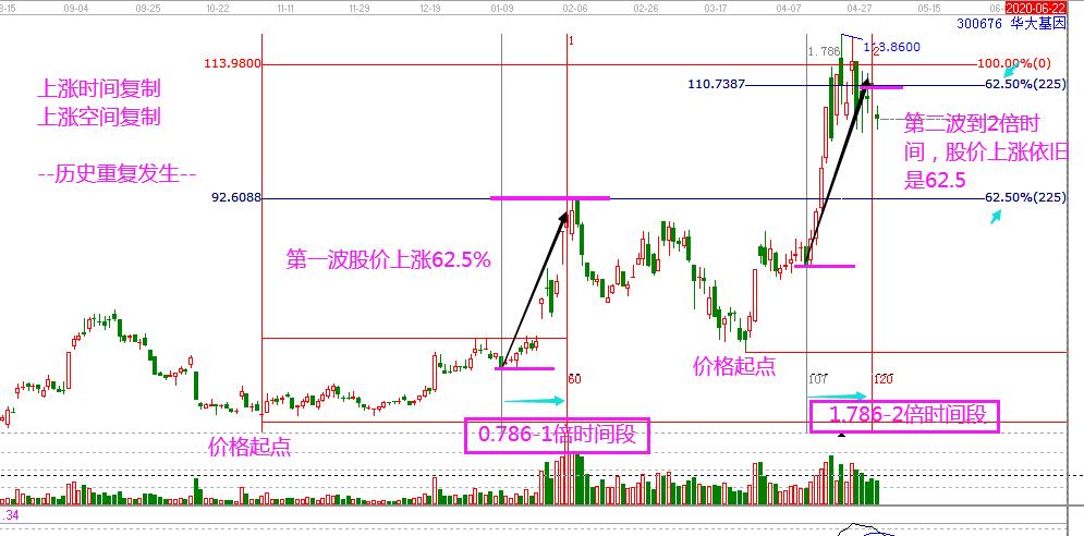 南極電商的時空走勢更是接近于完美復制,時間上0.618倍時間上漲到1倍時間窗口,股價上漲28.3%;1.618倍時間上漲到2倍時間窗口,股價上漲57.3%,接近2倍,這是江恩所強調的倍數關系。我們發現市場完美的復制歷史上漲的時間,而空間則是倍數關系。