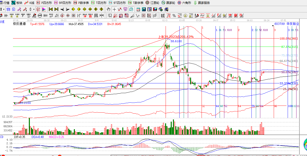接下來該股如何操作跟進,大家可以看下華友鈷業(yè)的最新分析圖。6月16日時間窗當天和價格共振選擇往上,目前突破180度位置,逼近藍色上軌線那里 。目前藍色上軌線壓力價格是40.3元那里,屆時需要關(guān)注壓力的突破情況,下一個時間窗在3倍時間窗7月2日。