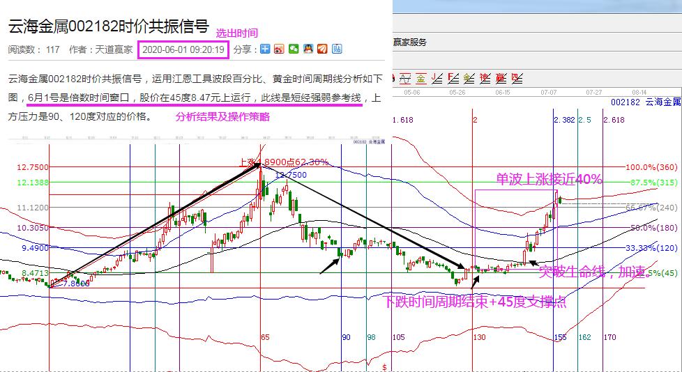 云海金屬:6月1日時間窗口選出,這天就是倍數時間窗口,市場的下跌周期結束,同時股價處于重要支撐點附近,符合時價共振規則。因而開始跟蹤,隨后股價在45度支撐上方震蕩,并在6月23日突破生命線進入強勢區,隨后開始加速上漲,截止周五收盤,股價上漲到紅色線附近。從選出單波上漲的幅度接近40%。若從突破生命線的右側信號算起,接近35%。這就是一個經典的左側買入操作案例。