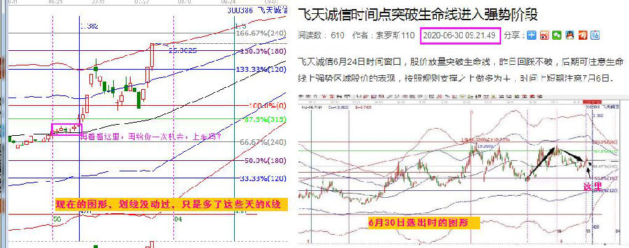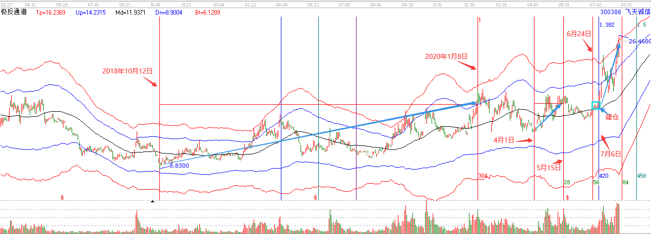 下面我們就通過時間和空間兩個方面來分析飛天誠信的買入點位。首先,我們通過時間分析工具(黃金時間周期線)來對2018年10月12日~2020年1月8日這段走勢進行研究,發現其在藍色豎線的位置發生了趨勢變化,那么在未來同樣7月6日藍線的位置會不會變化呢?其走勢證明在藍線的位置,股價開始了快速拉升階段。然后在通過時間分析工具(等距時間周期線)來對2020年4月1日~2020年5月15日這段走勢進行研究,發現其在6月24日也是一個時間窗口。而在這一天股價站上了極反通道的黑色生命線這個重要支撐位置,隨后幾天在對支撐進行確認之后,在前面提到7月6日藍線的位置開始了快速拉升。