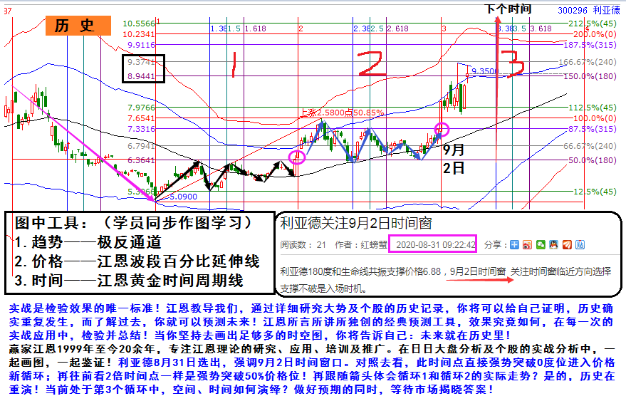 贏家江恩1999年至今20余年,專注江恩理論的研究、應(yīng)用、培訓(xùn)及推廣。在日日大盤分析及個(gè)股的實(shí)戰(zhàn)分析中,一起畫圖,一起鑒證!利亞德8月31日選出,強(qiáng)調(diào)9月2日時(shí)間窗口。對(duì)照去看,此時(shí)間點(diǎn)直接強(qiáng)勢(shì)突破0度位進(jìn)入價(jià)格新循環(huán);再往前看2倍時(shí)間點(diǎn)一樣是強(qiáng)勢(shì)突破50%價(jià)格位!再跟隨箭頭體會(huì)循環(huán)1和循環(huán)2的實(shí)際走勢(shì)?是的,歷史在重演!當(dāng)前處于第3個(gè)循環(huán)中,空間、時(shí)間如何演繹?做好預(yù)期的同時(shí),等待市場(chǎng)揭曉答案!