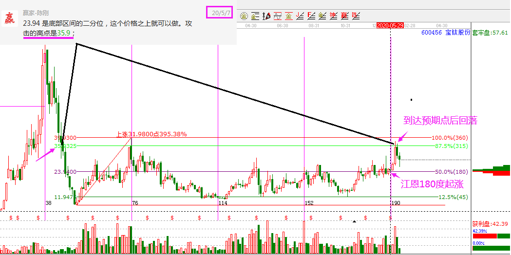 股票操作到最后其實(shí)就是買和賣的問題,因此買賣點(diǎn)的確定,甚至比選股更重要,因?yàn)槿魏喂善保胁▌?dòng)就有套利空間。但是,對(duì)于價(jià)格的分析,大部分投資者依舊停留在看均線指標(biāo)這種簡(jiǎn)單的跟隨上,依據(jù)這個(gè)想要判斷出好的買點(diǎn)和賣點(diǎn)難度太大。江恩理論是一套技術(shù)分析體系,其核心之一就是價(jià)格空間分析,借助江恩工具可以快速的判斷出市場(chǎng)的波動(dòng)空間以及當(dāng)下的支撐阻力點(diǎn),而在確定了支撐-買點(diǎn)的位置,也同時(shí)確定了阻力的賣出位置,以及不及預(yù)期的止損點(diǎn)。這就是提前對(duì)市場(chǎng)價(jià)格走勢(shì)作出預(yù)判的過程。寶鈦股份5月初的分析,按照江恩操作規(guī)則,一線站穩(wěn)看高一線,股價(jià)在時(shí)間窗口突破站上180度23.94之后,價(jià)格目標(biāo)點(diǎn)看高一線到315度35.9。