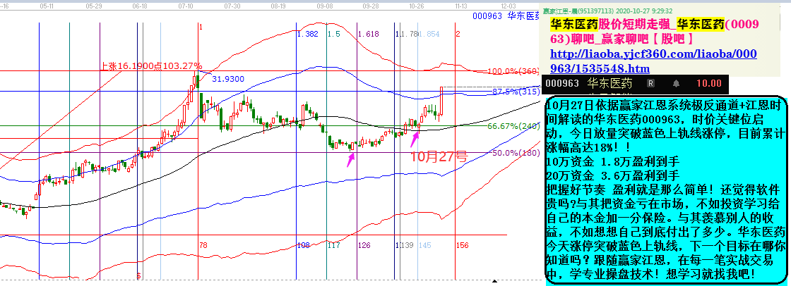 10月27日依據贏家江恩系統極反通道+江恩時間解讀的華東醫藥000963,時價關鍵位啟動,今日放量突破藍色上軌線漲停,目前累計漲幅高達18%!
