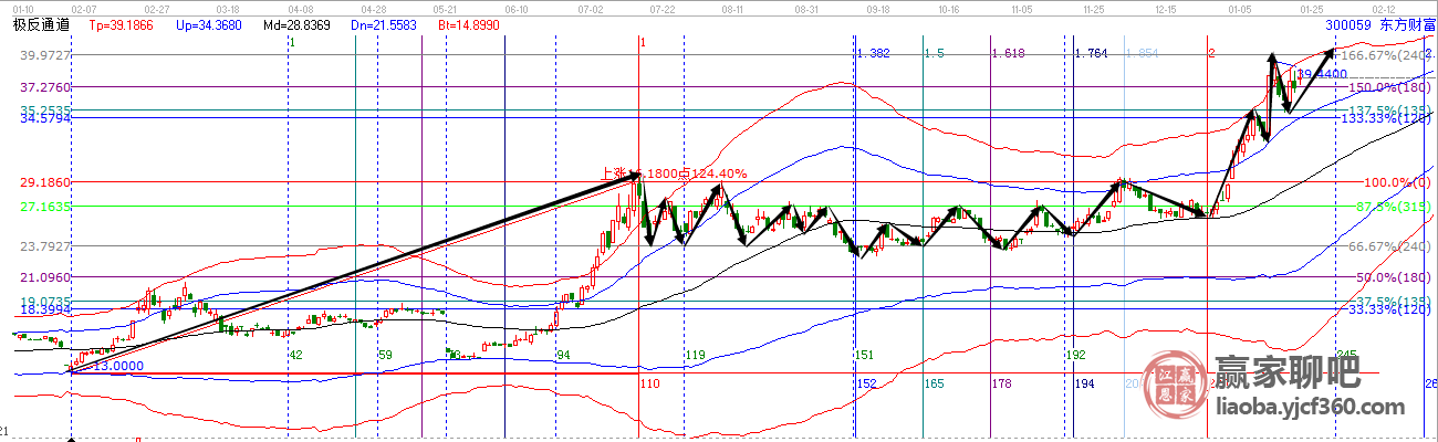 再來看看我們持續(xù)跟蹤2年之久的東方財富,你想要的轉勢信號。不管是中期波段還是短期波動,贏家江恩未來先知時價圖全部打盡。每一個箭頭,都是一段波段,都是一組低吸高拋,都是標準的買賣信號,市場到底有多美,你不懂江恩的視角,永遠也看不到。很多人會問,江恩技術準不準?看看東財?shù)膱D,已經走出來的高低點,有多少落到了江恩線上,那就有多準。不是準不準,而是當你一旦捕捉到了個股的規(guī)律,準的你不敢相信。這就是股市,這就是江恩時價技術的魅力,好圖只遇有心有緣之人,想深入學習,聯(lián)系我吧!