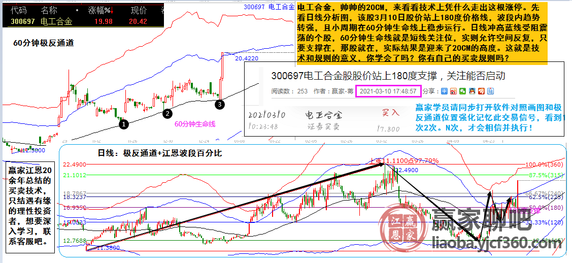 電工合金,帥帥的20CM,來看看技術上憑什么走出這根漲停。先看日線分析圖,該股3月10日股價站上180度價格線,波段內趨勢轉強,且小周期在60分鐘生命線上穩步運行。日線沖高藍線受阻震蕩的個股,60分鐘生命線就是短線關注位,實則允許空間反復,只要支撐在,那股就在,實際結果是迎來了20CM的高度。這就是技術和規則的意義,你學會了嗎?你有自己的買賣規則嗎?