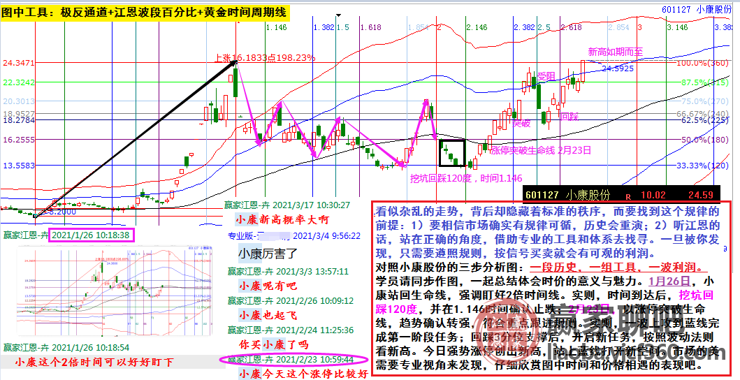1月26日,小康站回生命線,強調盯好2倍時間線。實則,時間到達后,挖坑回踩120度,并在1.146時間確認止跌;2月23日,以漲停突破生命線,趨勢確認轉強,符合重點跟進規則。實則,一波上攻到藍線完成第一階段任務;回踩3分位支撐后,開啟新任務,按照波動法則看新高。今日強勢漲停創出新高,站上藍線打開新空間。市場的美需要專業視角來發現,仔細欣賞圖中時間和價格相遇的表現吧。