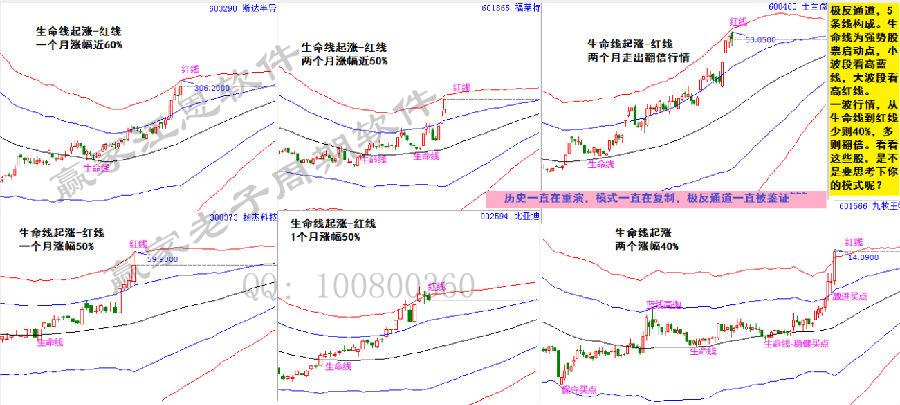 極反通道,是贏家江恩經典趨勢買賣分析工具。其中生命線為強勢股票啟動點,買在生命線,小波段看高藍線,大波段看高紅線。一直在重演,一直被驗證。對照圖中個股,均為生命線處選出關注,再看這一波行情,從生命線到紅線少則40%,多則翻倍。思考下這種模式。