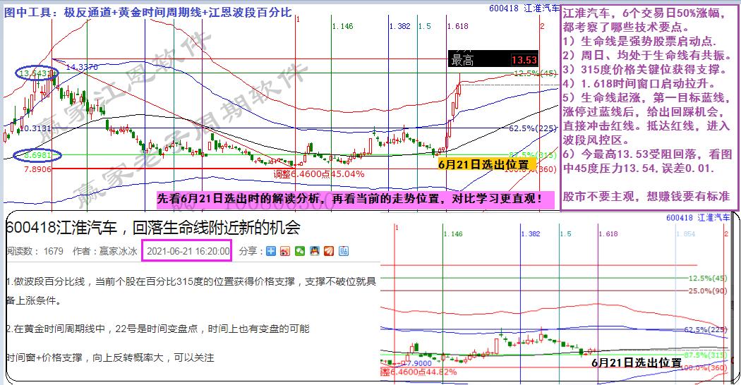 先看6月21日選出時的解讀分析,再看當前的走勢位置,對比學習更直觀!要擅于總結牛股快速走強的技術條件,建立相應的交易標準,定能克服主觀,依市場信號有效獲利。