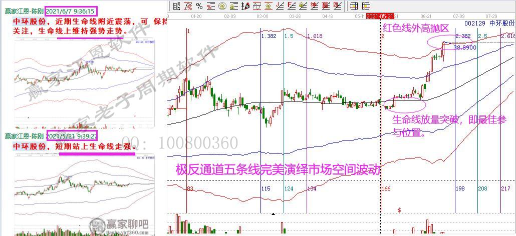 5月21日時間窗口開始關注中環股份,當日,生命線跌破后,5月31日再次放量突破,回踩不破,構成最佳生命線技術買點。隨后開啟拉升階段。今天再次放量大漲,股價突破紅色線,生命線啟動后累計上漲超過40%;紅色線外高風險區,保持謹慎。從買到賣,從生命線到紅色線,交易信號明確。極反通道完美把握市場的空間波動。按照買賣信號交易,做理性投資。