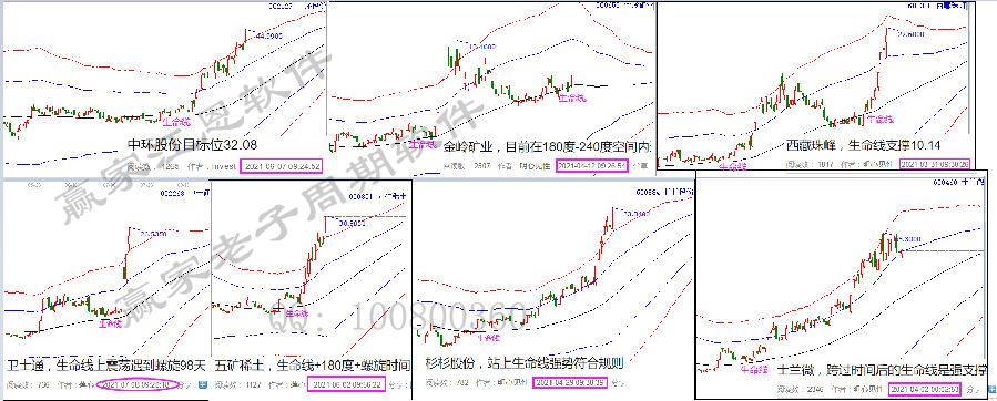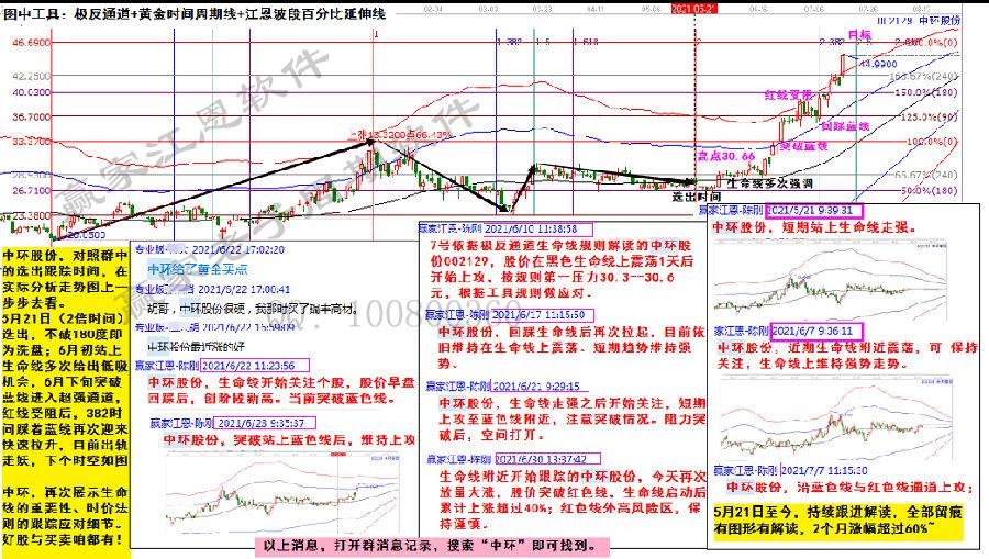 中環股份,對照群中的選出跟蹤時間,在實際分析走勢圖上一步步去看。5月21日(2倍時間)選出,不破180度即為洗盤;6月初站上生命線多次給出低吸機會,6月下旬突破藍線進入超強通道,紅線受阻后,382時間踩著藍線再次迎來快速拉升,目前出軌走妖,下個時空如圖!