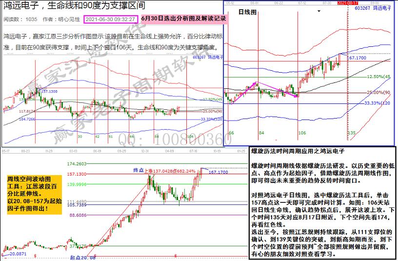 對照鴻遠電子日線圖,選中螺旋歷法工具后,單擊157高點這一天即可完成時間計算。如圖:106天站回日線生命線,確認趨勢拐點后,展開這波上攻。下個時間135天對應8月17日附近,下個空間先看174,再看紅色線。