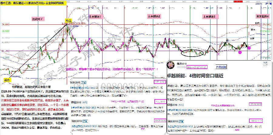 以29.68-74.68這波上漲為歷史因子,分別做江恩波段百分比、黃金時(shí)間周期線,再調(diào)出極反通道即可得出上圖。