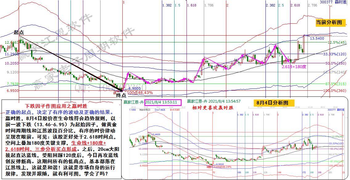 正確的起點(diǎn),決定了有序的波動(dòng)及正確的結(jié)果。贏時(shí)勝,8月4日股價(jià)在生命線符合趨勢(shì)規(guī)則,以前一波下跌(13.46-6.95)為起始因子,做黃金時(shí)間周期線和江恩波段百分比,有序的時(shí)價(jià)律動(dòng)呈現(xiàn)在眼前。可見:該股正好處于2.618時(shí)間點(diǎn),空間上疊加180度關(guān)鍵支撐,生命線+180度+2.618時(shí)間,三步分析買點(diǎn)形成。之后,20cm大陽拔起直達(dá)藍(lán)線,受阻回踩120度后,今日再攻藍(lán)線創(chuàng)反彈新高。這期間所有的低高點(diǎn),基本都落在江恩線上,這就是和諧!這就是市場(chǎng)自身的運(yùn)行規(guī)律,發(fā)現(xiàn)并跟隨,就有利可圖,學(xué)會(huì)了嗎?