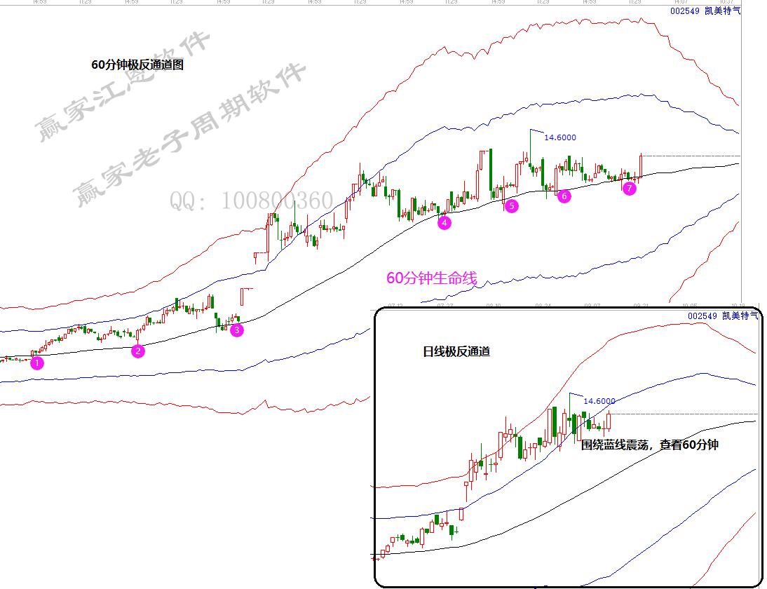 凱美特氣,繼續鞏固知識點:日線沖高紅線受阻后,依托藍色上軌線震蕩運行,短線信號參考60分鐘周期??梢钥吹?,每次觸及60分鐘生命線都快速拉起。贏家江恩對市場買賣信號的判斷,基于專業的工具和體系,更基于多年實戰應用總結得出的經驗技巧。請每位學員都牢記并去應用,將其變為自己的獲利技能。