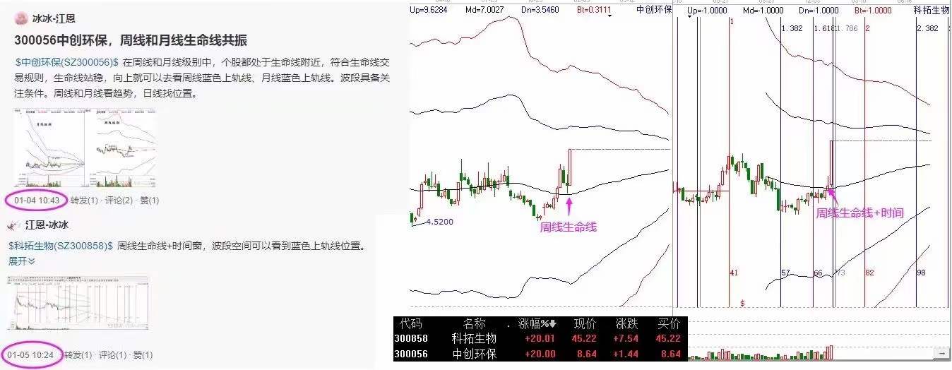 當股價月線,周線,都處于生命線附近的時候,同時,日線也處于生命線附近,這就形成了長期,中期,短期的趨勢共振,這就是一個非常好的建倉買入信號。據此篩選出的中創環保、科拓生物,今天雙雙20c封板漲停。我們無法決定市場會怎么走,能做的只有提升自己的理解,在符合操作的買點買入,在符合賣出的信號賣出,僅此而已,江恩理論體系,幫助大家提前做市場預判,并利用江恩規則去進行跟隨。這就足矣。