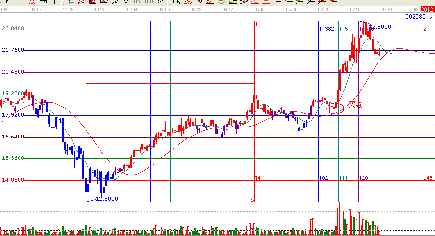 第二:依據贏家江恩分析系統時間工具黃金時間周期線分析:此票在6月29日提示1.5的變盤窗口,(黃金時間周期的取點,起點2012年1月6日,終點2012年5月7日的連線)
