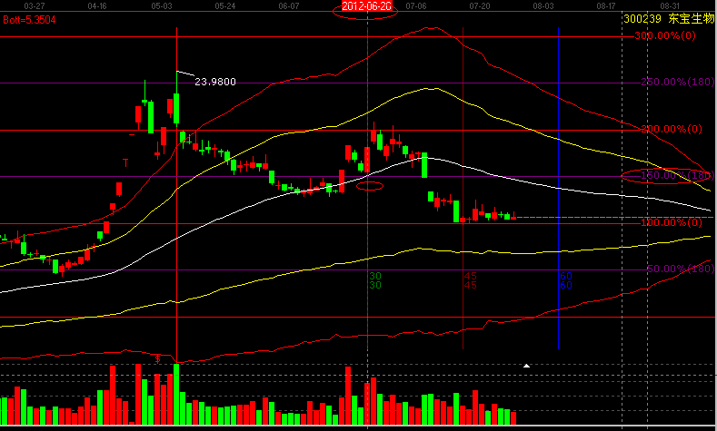 第三:價(jià)格分析:江恩價(jià)格百分比,300239,6月26日、縮量回落在江恩價(jià)格百分比180度支撐線獲得支撐,(畫法,選擇一個(gè)波段的高點(diǎn),或者低點(diǎn),拖動(dòng)鼠標(biāo)即可,我們選擇2012年1月6日的低點(diǎn)為起點(diǎn),作圖)