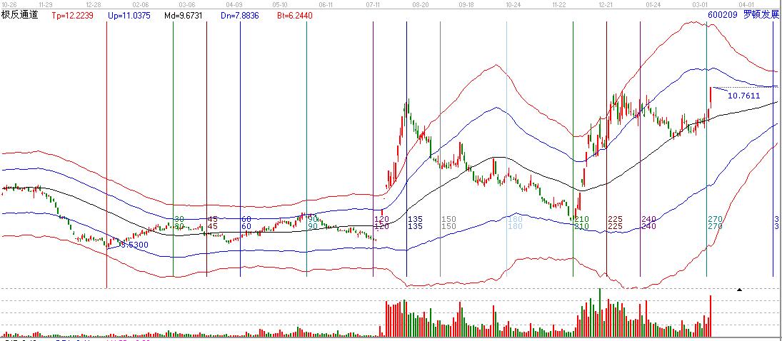 我們以600209羅頓發展2012年3月30日為起點做自定義周天江恩時間循環工具圖,可看出羅頓發展(600209)60度位置12.04.11日啟動,漲到了極反通道上軌位置90度時間,波段30周天漲幅收益29.3%。在90度位置到120度時間的下跌跌了30%多,跌倒120度位置然后就開始了一波120度到135度的瘋狂拉升,短期漲幅170%更為神奇的是羅頓發展在135度位置展開了一波長期下跌一直殺跌到極反通道跟時間210度位置,再一次演繹了神奇的拉升。240度位置2013-01-15再一次殺跌,然后在極反通道生命線跟其270度位置2013-03-05日再一次拉升漲停