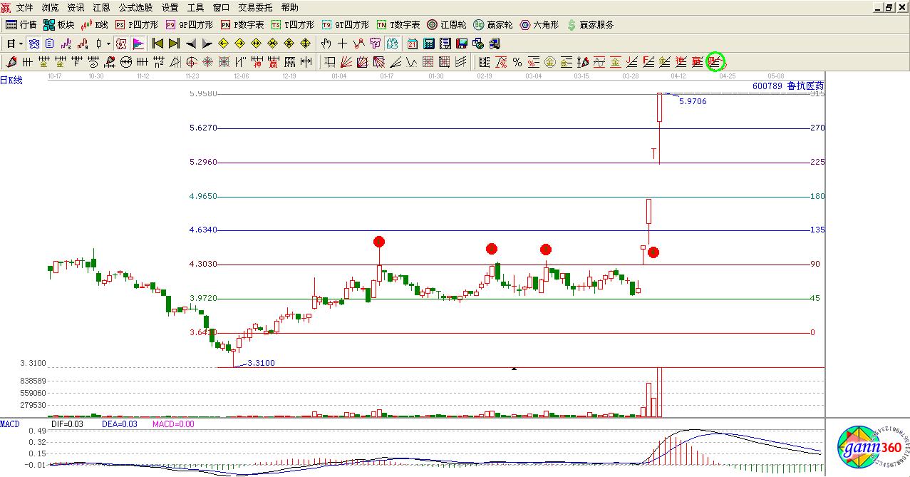 600789在2012-12-04日低點3.31位置上行至2013-01-15最高位置4.48位置這里4.30是其K線價格四方形90度位置壓力位置,然后展開了第一次回調調整至45度位置再一次上行在2013-02-22日第2次挑戰90度位置再一次遇阻回落明顯的45度位置強支撐最低位置都沒有碰到這里3.97位置在2013-03-06日第3次挑戰90度位置依然沒有結果。最為重要的是其2013-04-01日再其消息的刺激下(H7N9)禽流感。快速突破90度位置封死漲停。成功的完成了一個4次的突破,消息技術的結合無疑是最佳的介入點。之后伴隨著消息的持續性,連續4個交易日拉出4個漲停。實現了一次質的改變。這就是消息跟江恩4次的完美配合。所以下一次遇到江恩4次的股票,一定要注意了哦。特別是消息配合的股票。