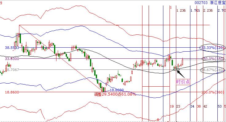 2.工具解析:先看極反通道,市場在6月23日,漲停突破生命線,其后回踩后繼續拉升,再次到達藍色線后回落,目前再次調整到生命線附近,整個波動符合極反通道的“一線站穩,看高一線;一線過不去,回調一線”的操作規則。同時結合價格工具可以發現市場的趨勢強勢,同時,6月24日生命線與價格工具的240度形成了價格上的共振,構成了一個階段的買點;而在8月4日時間窗口附近,市場再次回落到生命線與240度支撐共振位,時間與價格形成共振,價格與價格形成共振,因此在8月4日前后,是該股的最佳買入位置,其短期的壓力位則是180度位置的33.63附近,突破看高到藍色線附近。