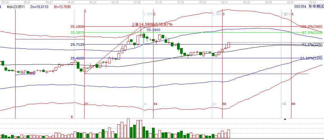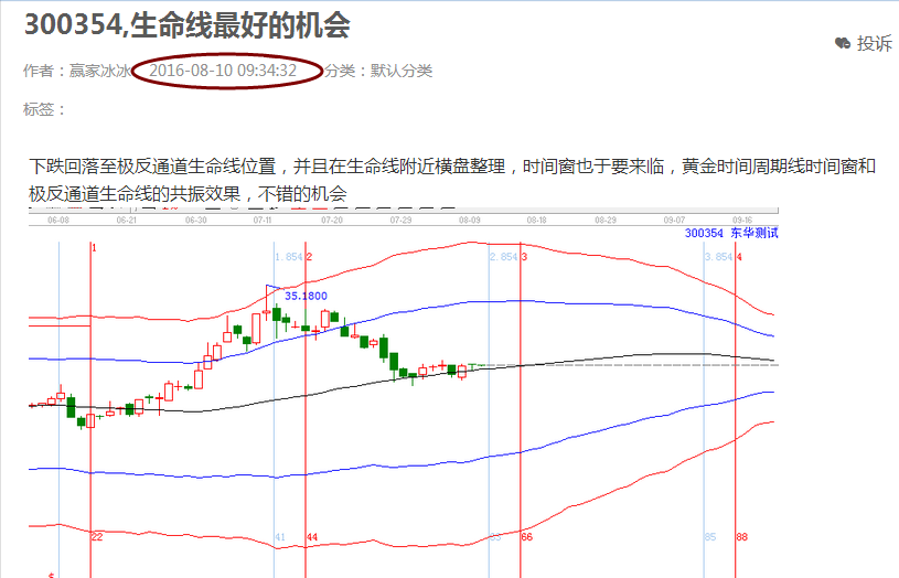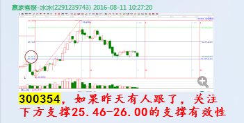 2.江恩工具分析共振:贏家聊吧在8月10日發布300354相關分析貼。時間窗和極反通道生命線形成共振。形成了操作的條件,然后回調了兩天時間,在群里有跟蹤分析,關注25.46的支撐有效性,經過調整確認,回踩在支撐位止跌,正是開始上漲。