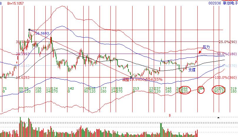 2.工具解析:市場近期的走勢還是比較符合極反通道的,前期在6月28日漲停突破生命線后上漲到藍色線阻力開始回落,其后再次回落生命線并短暫的破位,并在8月8日放量突破站上生命線,其后期回踩不破,都是非常棒的買點;同時,從價格工具上也可以看出270度分割位的支撐,與極反通道形成共振價位。因此,按照趨勢工具及價格工具,生命線附近即可參與。所以在8月9日按照工具提示該股的一個買入計劃。后期生命線不破,持股到藍色線附近,當前也在預期中到達。