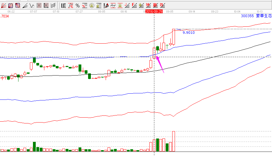 在看下面的日線圖形中,我們看到,向上放量突破了極反通道藍色上軌線位置,從短線上看,也符合了極反通道藍色上軌線操作規則。是周線和日線的共同買點。