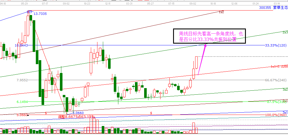 再看當前的周線圖形。利用角度線和波段百分比,可以看到在突破角度線1*1線之后,目標位就是上方的2*3線,同時也是波段百分比33.33%共振的位置,即10.85附近,可以繼續放心持股,等待目標位到達。