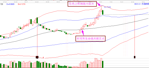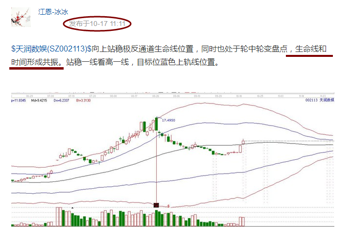 江恩分析圖形:依據贏家江恩極反通道操作規則,當個股處于極反通道生命線上,則個股處于可操作區域,當個股處于生命線下,則暫時放棄。通常情況下,當個股向上突破極反通道生命線位置,則生命線附近就是最佳的買點位置。天潤數娛在10月17日向上突破極反通道生命線位置,突破生命線開啟新的一輪行情,因此我們在17日選出該股。