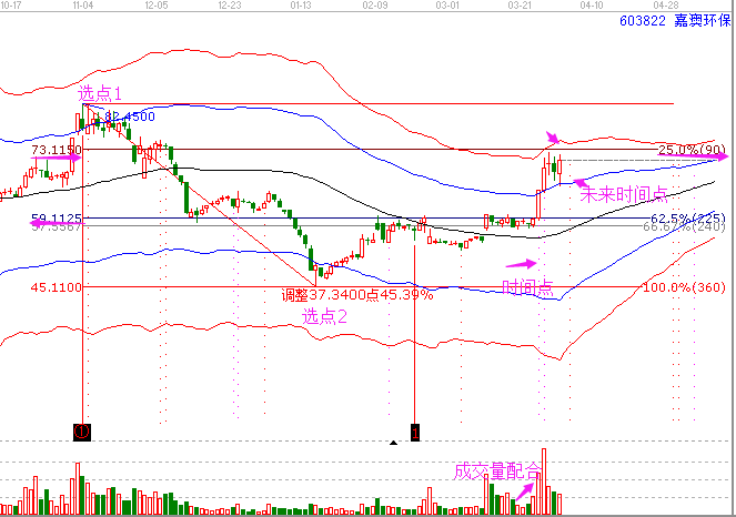 在我們深入了解上面的圖形前,我們來(lái)簡(jiǎn)單了解一下什么時(shí)間跟的時(shí)價(jià)共振。時(shí)間和價(jià)格的關(guān)系是江恩理論研究的一對(duì)經(jīng)典關(guān)系。時(shí)價(jià)共振是指當(dāng)價(jià)格到達(dá)重要重要的位置(壓力或者支撐),時(shí)間窗口到來(lái),確定我們買入或者賣出的操作。下面我們來(lái)看上圖中嘉澳環(huán)保603822的走勢(shì)。買入的時(shí)候股價(jià)遇到了江恩波段百分比225度位置支撐,下面的虛線是時(shí)間工具江恩輪中輪變盤點(diǎn),整好是買入的那天為時(shí)間變盤點(diǎn),這都成就了這個(gè)買入的操作,當(dāng)然也收獲了到利潤(rùn)。下面我們來(lái)看嘉澳環(huán)保的完整圖形。