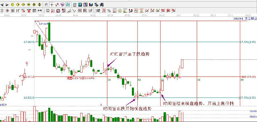 江恩理論依據:當是價位和時間形成四方形,市場轉勢便迫在眉睫。即當時間窗到、價格也到位,二者形成共振,那么市場很有可能發生趨勢的反轉。價格支撐+時間窗=買點,價格壓力+時間窗=賣點。