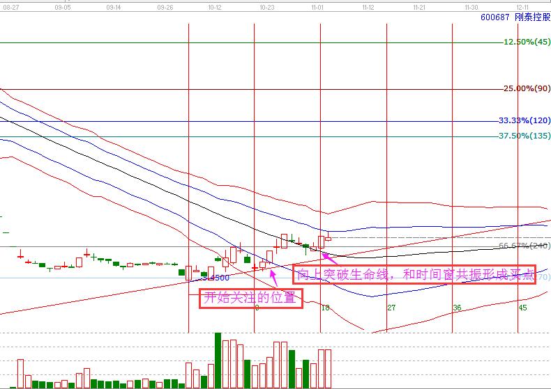 第二波:剛泰控股向上突破生命線位置,然后圍繞生命線震蕩,符合生命線最佳買點,再做時間周期分析,1號為等距時間變盤點,即將發生趨勢反轉,時間和生命線共振,因此在31號贏家江恩群中做提示:1號時間窗,即將再次拉升。用戶在30號、31號、1號分別再次買進剛泰控股在1號收大陽線,2號再拉升,累計獲利15%左右。