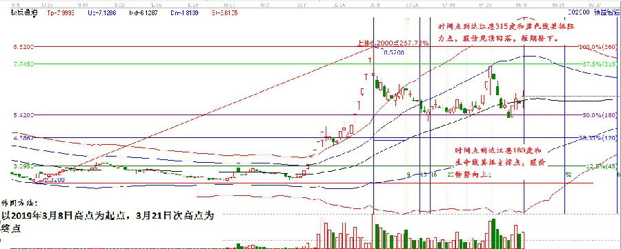 筆者將兩組時間圖形融合在一起,可以看到關(guān)鍵的啟動點2019年2月20日突破趨勢向上,開啟快速拉升行情;5月9日為兩組時間工具的共振時間點,股價從生命線拉起漲停,開啟新一輪的上漲。具體不再細說。