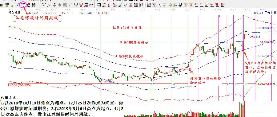 亞光科技(300123):1.以2018年10月19日低點為起點,12月25日次低點為終點,做出江恩螺旋時間周期線;2.以2019年3月6日高點為起點,4月2日次高點為終點,做出江恩螺旋時間周期線。做出兩組時間工具,結(jié)合極反通道,可以得出如下分析圖形: