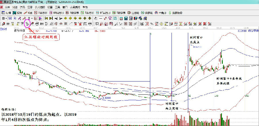 本周帶大家學習一個預(yù)判時間窗口的工具-江恩螺旋時間周期線。時間分析是有江恩首次引入到金融市場中,開啟了金融市場技術(shù)分析的新方向,江恩理論認為,時間是決定市場走勢的最重要因素,而經(jīng)過我們的長期實戰(zhàn),發(fā)現(xiàn)當時間和價格形成四方時,市場會發(fā)生趨勢的反轉(zhuǎn),或出現(xiàn)大陰大陽的劇烈波動,同時伴隨著成交量的放大。我們進行時間分析,最重要的目的是判斷市場是處于上漲或下跌趨勢的什么階段,根據(jù)價格做好下一步走勢方向的預(yù)判。江恩螺旋時間周期線就是這樣的一個具備超強實戰(zhàn)意義的時間分析工具。接下來,筆者以兩個股票的具體走勢為例做個展示幫助大家了解該工具的具體應(yīng)用。