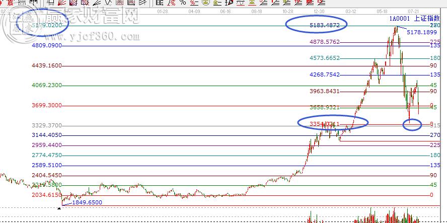 如上證指數分析圖。我們選取K線價格四方形這個江恩特色價格工具,分別以1849和3049兩個重要低點作為起點,步長采用起點縮小十倍作圖如下。可以看到1849出發的180度落在了5179,而3049出發的270度落在了5183,兩者都同時顯示5180附近是重要的壓力區,兩組循環的重要角度疊加共振——5178頂部形成,必須高拋,換來了一路暴跌!自5178的暴跌在下方315度和0度相交的位置3354附近形成支撐帶,而實際市場在3373點展開了反彈。