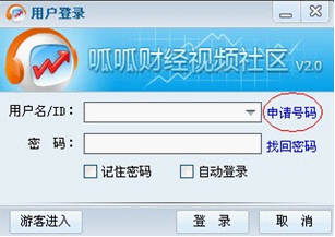 第三步:安裝好后桌面出現"呱呱財經視頻社區",雙擊,點擊申請號碼。申請號碼,像QQ一樣,號碼申請完畢后記住號碼,然后登陸大廳