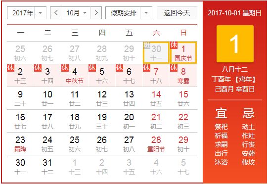 根據(jù)國家假期安排并結(jié)合贏家財富網(wǎng)實際情況,現(xiàn)定于2017年10月1日(周日)下午至2017年10月8日(周日)為國慶、中秋放假日期,放假期間網(wǎng)站暫停客服咨詢等相關(guān)服務,網(wǎng)站仍可正常使用,2017年10月9日(周一)在線咨詢等服務恢復正常。假期期間客戶如需咨詢相關(guān)業(yè)務,可撥打值班電話:13333833889,進行咨詢!具體的放假時間休息如下圖。