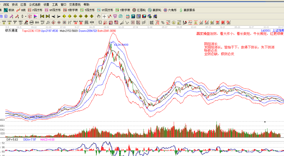 那么我們?cè)趺蠢斫怅庩柲兀靠梢詮闹袊鴤鹘y(tǒng)哲學(xué)《易經(jīng)》中找到答案。也可以從生活中得到答案,陽K線是用紅色表示,紅色代表著吉祥、喜氣、奔放、激情。陽是向外伸張,大家看到手中的股票上漲,心情就會(huì)變的喜悅,陰是向內(nèi)收縮的,股票下跌的時(shí)候像吸了一口涼氣,渾身打哆嗦,發(fā)冷,晴天為陽,陰天下雨是陰天。白天是陽,晚上是陰,所以一個(gè)人白天你要精神好,要陽氣足,你才能夠做事情,到了晚了你慢慢要陰起來,要讓他冷靜,然后才可以好睡覺;天是陽,地是陰,手心是陽,手背是陰,手心手背都是肉,這是陰陽合一。自然界中沒有純陰純陽之物,在股市中可以理解為沒有只漲不跌的牛市,也沒有只跌不漲的熊市,世間萬物都是相對(duì)的。有高必有矮,有肥必有瘦,有長必有短,而物極則必反,當(dāng)事物向某一個(gè)方向發(fā)展到了極致,到了盡頭之后,就會(huì)反過來朝另一個(gè)方向發(fā)展。一個(gè)趨勢到了盡頭之后,就開始另一個(gè)相反的趨勢,靜極生動(dòng),動(dòng)極生靜,世間萬物都有種情況,股市也不例外