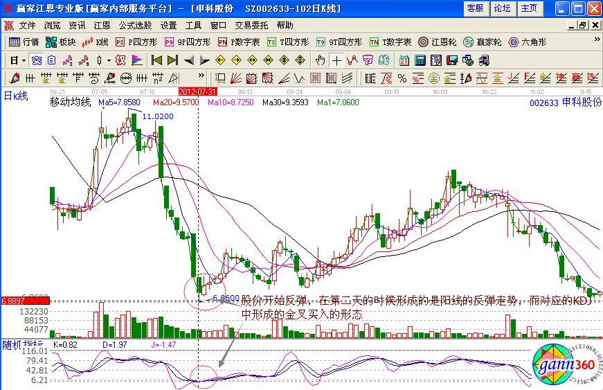 如果感覺對這一則實例的應用不是很熟練,我們可以在觀察一則實例重點分析kdj指標的應用,比如中信國安(000839)的周K線走勢圖,在2011年11月中旬的時候股價在9.87元的位置見頂之后,出現連續的急跌,形成雪崩式下跌形態,是八連陰的K線組合,在出現第6根陰線的時候,其kdj的J值是-0.27,而且連續三周出現的都是負值,而且在第9周的時候,收出陽線,說明多頭開始改變被動的局面,投資者可以考慮逢低介入搶注反彈。