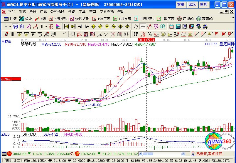 首先,皇庭國際在2011年5月份之前,已經(jīng)經(jīng)過了一輪的上漲,前面一輪均線上呈現(xiàn)的是多頭排列,我們圖中可以看到該股在5月19日的時候,雖然收類似的十字星形態(tài),但是相對前一天來說仍然是一個假陰,股在接下來的兩天該股連續(xù)兩天收陰線,所以筆者在連續(xù)下跌的三天之后,在5月24日的時候以21.68元的價位買入,在次日以22.7元的價位進(jìn)行賣出,獲利4.7%!