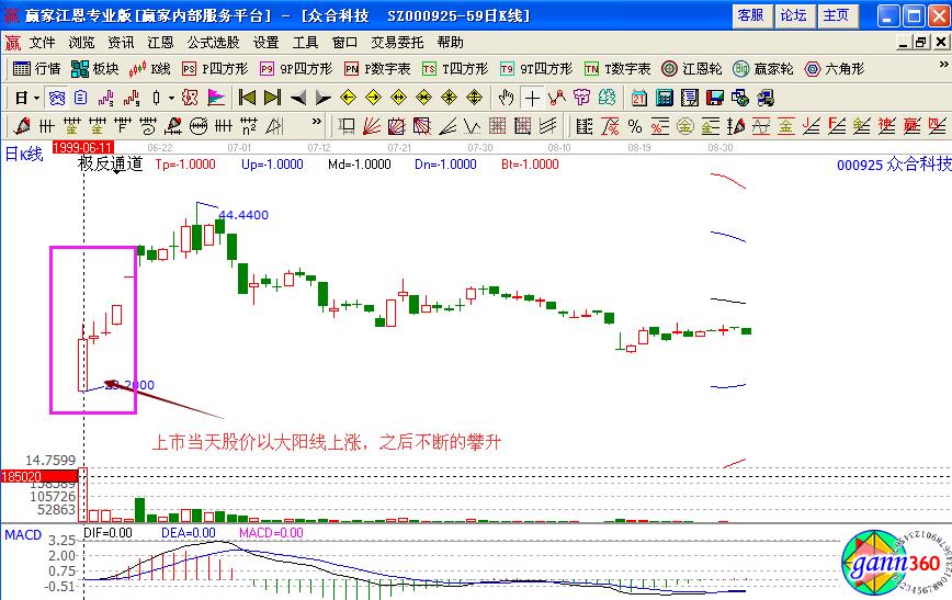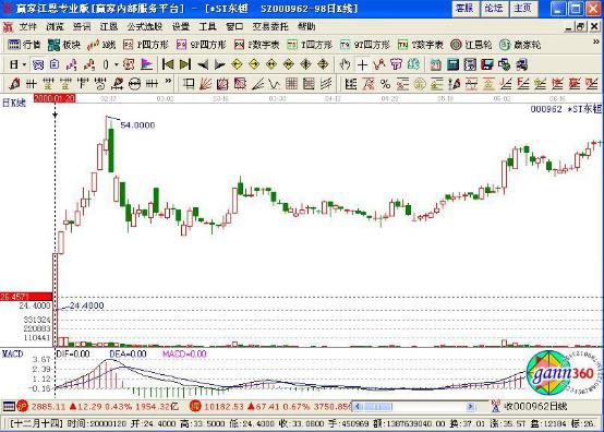 如下圖案例*ST東鉭(000962)在2000年1月20日上市,開盤價24.4元便成為最低價,當日強勢上攻,以幾乎最高價33.08元報收,成交4500萬股,約占流通盤6500萬股的70%,明顯屬于主力資金的拉高建倉行為,第二天低開高走,以光頭的陽線報收。至此,可基本確定為一頭短線瘋牛,投資者即可及時跟進,其后短短數天升幅高達50%。