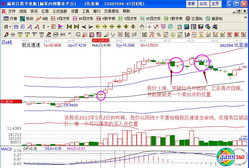 當(dāng)然,這個(gè)時(shí)候結(jié)合江恩軟件中的極反通道進(jìn)行說明,股價(jià)在2013年5月2日的時(shí)候,站穩(wěn)了生命線的位置,是一個(gè)可以介入的點(diǎn)位,之后在5月7日的時(shí)候形成了比翼雙飛K線的組合形態(tài),之后股價(jià)一路上漲突破了超強(qiáng)區(qū)域的紅色外軌線,并出現(xiàn)了回落的形態(tài),回踩紅色外軌線,并向下跌破,是一個(gè)賣出點(diǎn)的位置,這個(gè)時(shí)候投資者已經(jīng)獲利充足要及時(shí)的賣出。