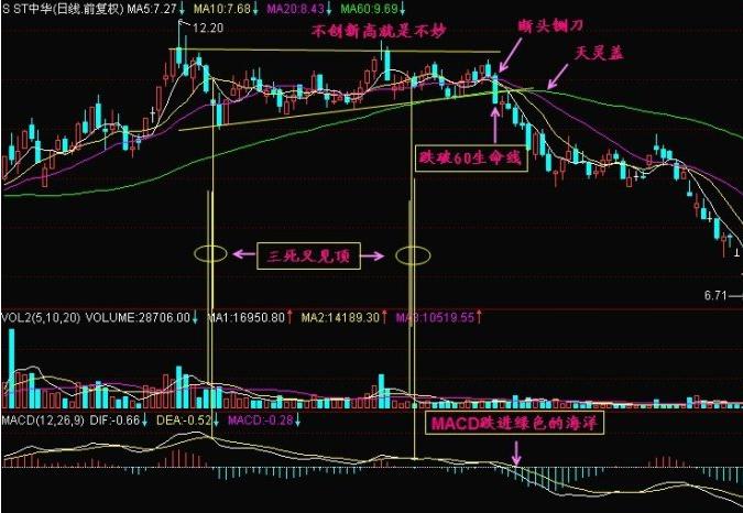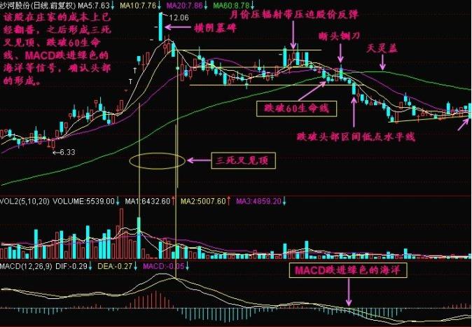 這里說一下,需要注意的地方,在一只股票上漲幅度很大之后,特別是股價在莊家的成本上已經翻倍之后,從客觀來講莊家已經有了派發的條件和理由,所以,如果在高位出現寬幅震蕩,并且反復出現“三死叉見頂”信號,此時的股價已經不能夠再創新高,換句話說就是創新高的難度大大增加,那么在這種情況下,一旦出現“跌破60生命線”、“MACD線跌進綠色海洋”等頭部信號,證明頭部成立,投資者應立即果斷做決定,不能猶豫。