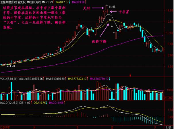 如圖該股在07年4月到7月的股價走勢,起初,莊家成本是很低的,在牛市中不斷的上漲獲利,股價在高位區間出現了一根具有長上影線的十字星,也可以說是“天針”,之后股價選擇下跌,形成了跌停板,而且均線形成的是死叉的賣出信號,投資者應該及時的把握操作的機會,在實戰中做好相應的投資策略。