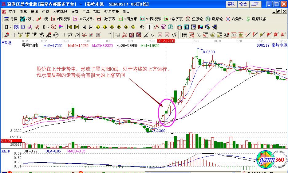 具體的實戰(zhàn)操作案例如圖600217(秦嶺水泥)在2012年12月6日的股價走勢形態(tài)變化,在上漲的過程中,出現(xiàn)了黑太陽的K線走勢形態(tài),處于均線的上方運行,預示著后期后很大的上漲空間,這個時候投資者可以在次日的時候進行中短線的建倉操作,并做好實戰(zhàn)操作的盈利準備。