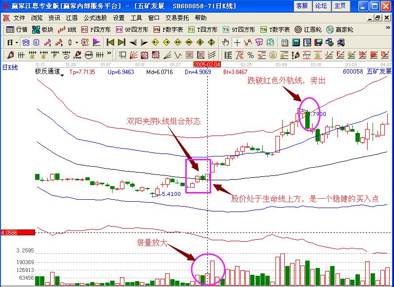 當然更加準確的買賣點位置,可以通過贏家江恩軟件的極反通道工具進行分析,如圖在05年2月4日的時候,股價K線形成了雙陽夾陰的走勢形態,而且這個時候的股價處于生命線的上方運行,是一個穩健的買入點,再結合倍量柱的基本形態,更加確信了買入點的位置,之后股價一路上漲突破了藍色上軌線,在8.79的位置處向下跌破了紅色外軌線,是一個上漲受阻,賣出的操作信號,投資者可以積極的賣出。