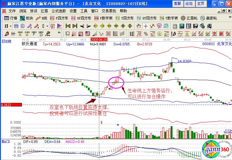 如果是在江恩軟件的極反通道中分析該股的買賣點位置,可以發(fā)現(xiàn)在2008年6月20日的時候,股價在藍色下軌線的位置獲得了上漲的支撐,并且K線形成的是小陽線,沒有完全覆蓋前面的陰線,量能變化較小,投資者可以進行試探性的建倉操作,之后股價一路上漲,在7月初的時候向上突破生命線,進入強勢區(qū)域運行,投資者可以適當(dāng)?shù)倪M行加倉操作。