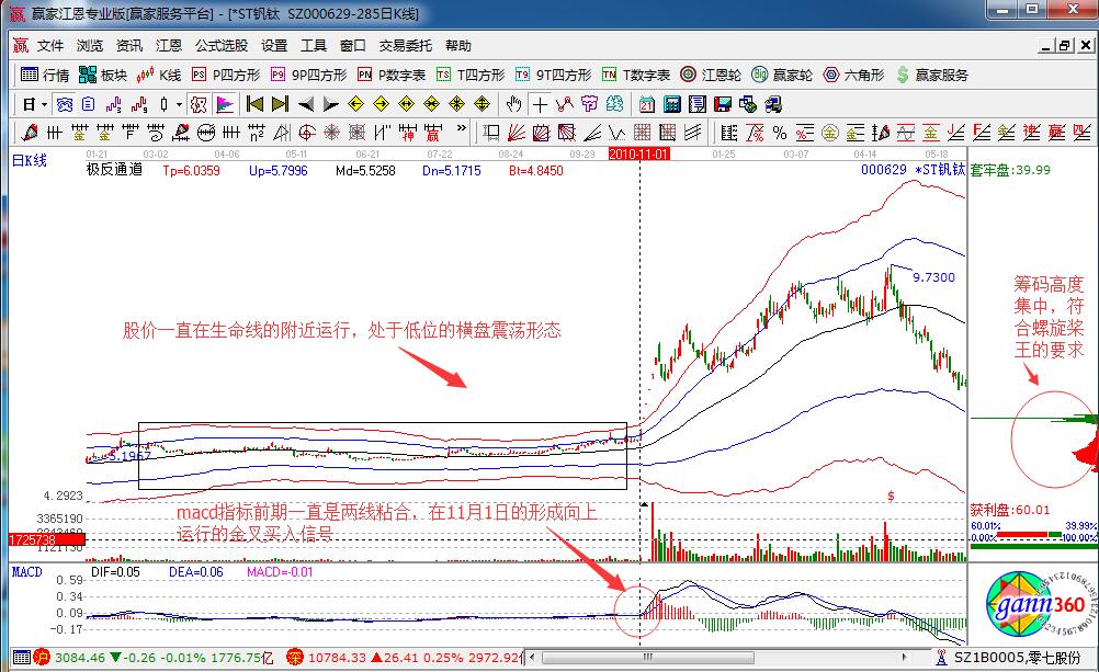 如圖000629的個股走勢形態,在2010年到2011年初的整體運行走勢,股價一直處于生命線的附近運行,并且是在低位進行的橫盤整理形態,量能也沒有太大的變化,但是在股價進入10年11月初運行的時候,股價向上拉升在生命線上方運行,量能有所變化,macd指標兩線形成的了金叉買入的操作信號,該股的籌碼形態比較集中,符合螺旋槳王的K線形態,大膽的投資者可以進行操作。